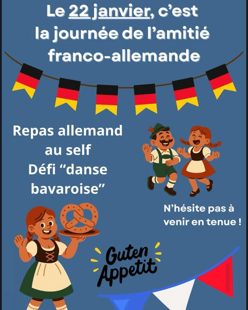 Le lycée Recouvrance se met aux couleurs et aux saveurs de l’Allemagne à l’occasion de la journée de l’amitié franco-allemande le jeudi 22 janvier. Viens relever le défi « danse bavaroise » à l’heure du déjeuner au self !