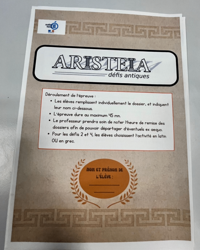 Bravo aux élèves de 3e et de 2nde latinistes et hellénistes qui ont participé à l’épreuve de sélection du concours Aristeia – défis antiques. Félicitations à eux pour leur engagement et leur enthousiasme ! Résultats dans quelques semaines pour savoir quels sont les 6 d’entre eux qui iront en finale …