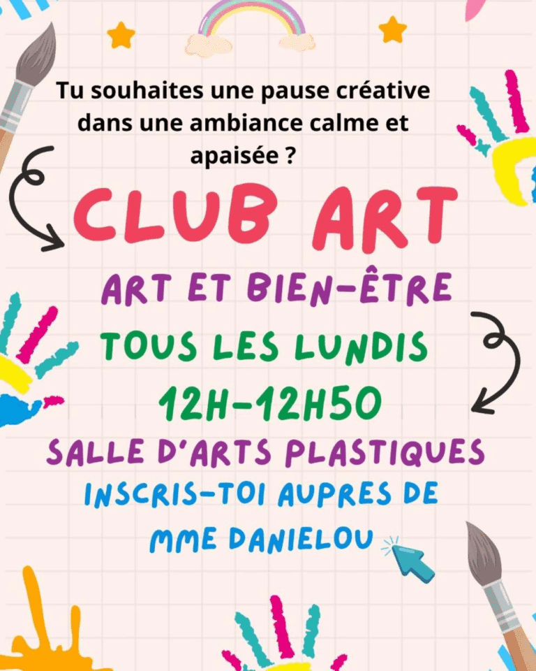 Club art et bien-être au collège (Jeanne d’arc) ! Inscris-toi auprès de Mme Danielou ! 1ère séance : lundi 29 septembre en salle d’arts plastiques.